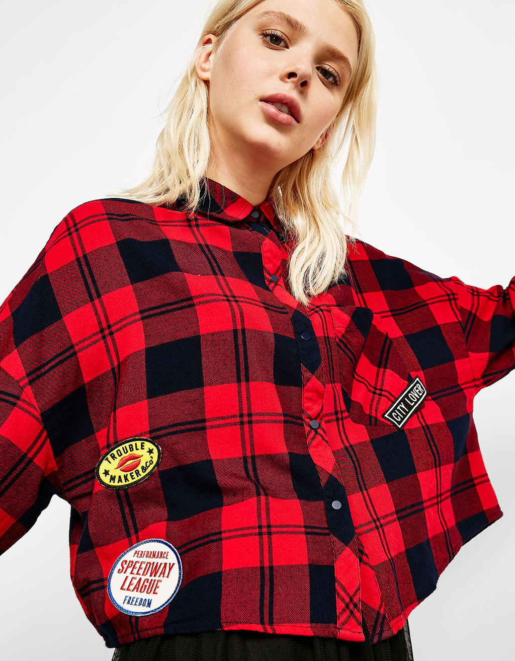 Este tipo de camisas están siendo muy comunes durante este año, consiste en una camisa normal, en este caso de cuadros, que lleva distintos parches por toda la camisa para darle un toque más original. Este tipo de camisas nos las podríamos poner con unos pantalones vaqueros y unas converse con un chaquetón negro, esto nos dará un estilo muy casual para poder ponérnoslo cuando queramos para ir cómodas y a la vez bien vestidas.Otra manera de utilizar esta camisa es ponérnosla sin abrochar y ponernos una camiseta debajo de ella, preferiblemente, más corta que la camisa o meterla por dentro del pantalón.
